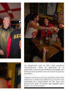 C’est dans cette continuité qu’est née, puis s’est solidement installée, la relation avec le BEC. Une association qui ne s’est pas construite sur une simple opportunité, mais sur une vision commune. Celle d’un sport fédérateur, porteur de valeurs humaines, où le collectif compte autant que la performance. Saison après saison, match après match, le Cock and Bull est devenu un prolongement naturel de la vie du club : un lieu où les joueurs, les supporters et les proches se retrouvent, loin du terrain mais toujours dans le même esprit.