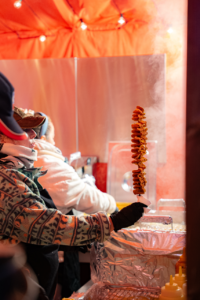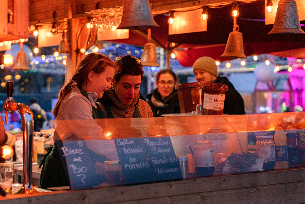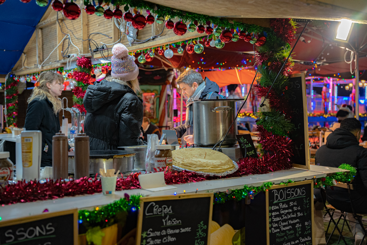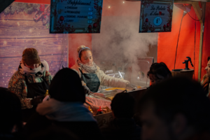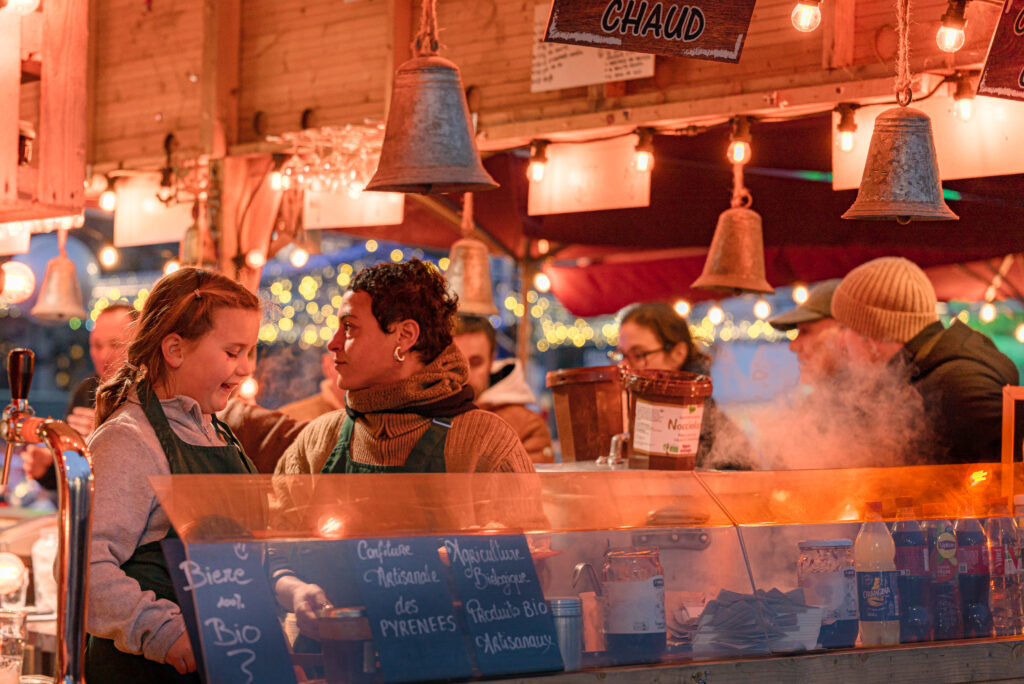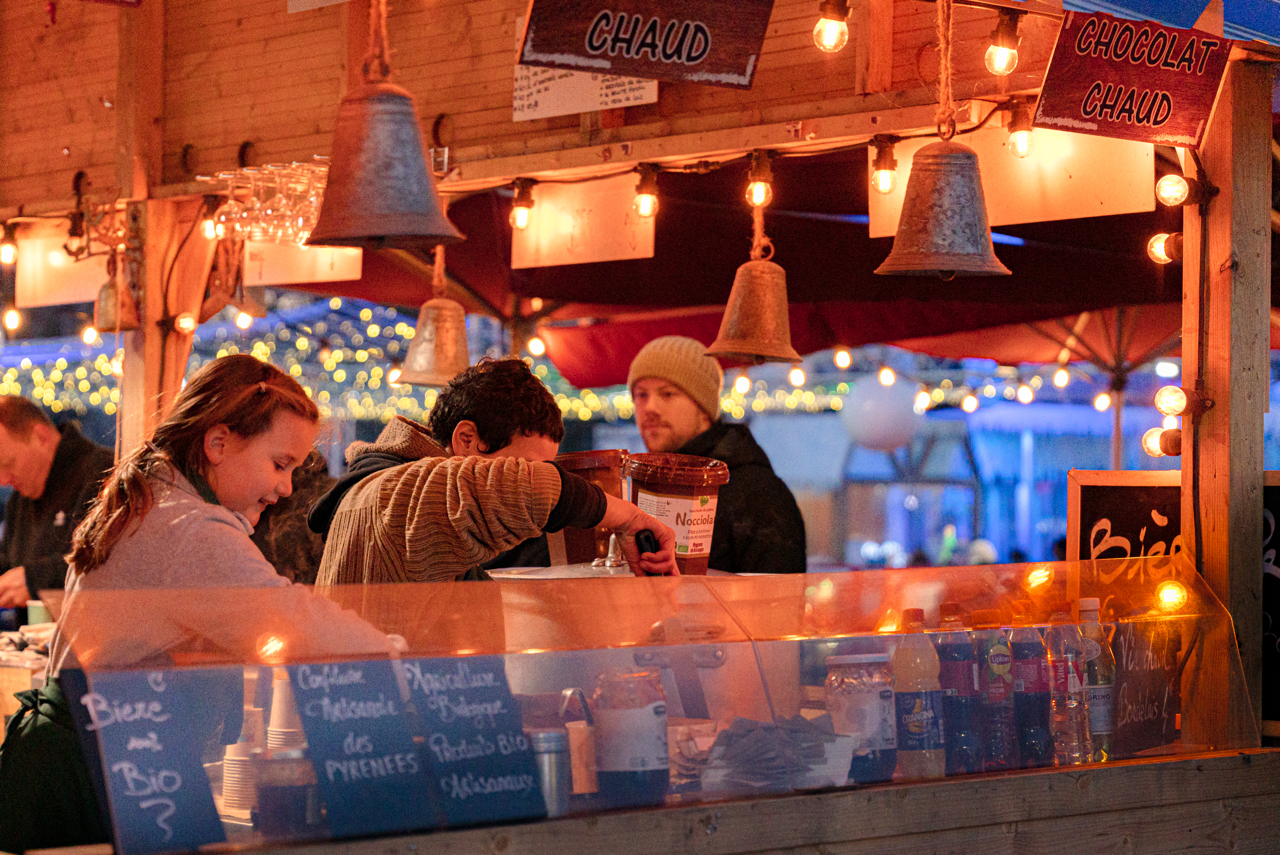 Le Marché de Noël de Bordeaux est aussi reconnu pour son ambiance gourmande. Les stands de restauration proposent vin chaud épicé, marrons grillés, chocolats chauds, spécialités sucrées et produits du terroir.