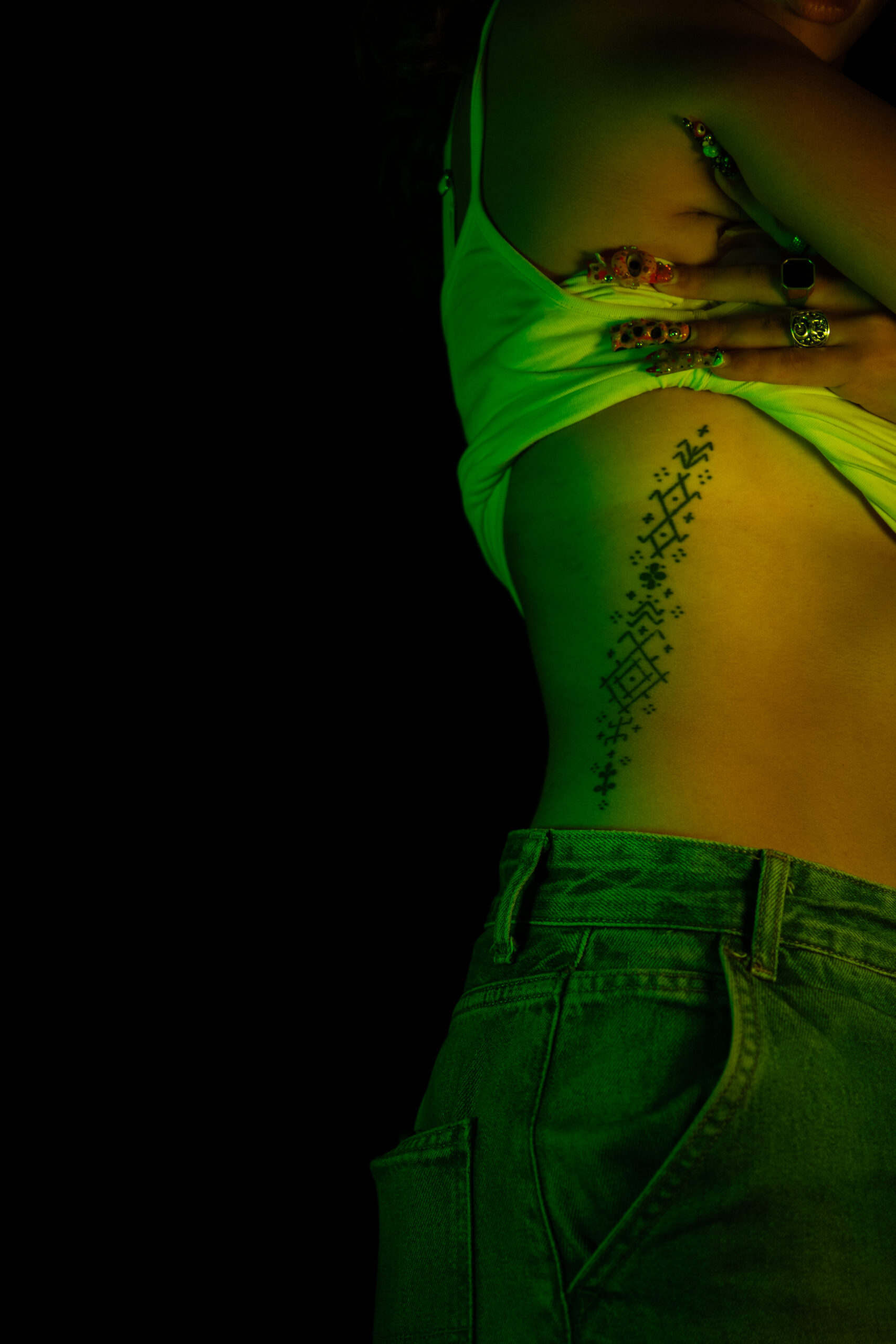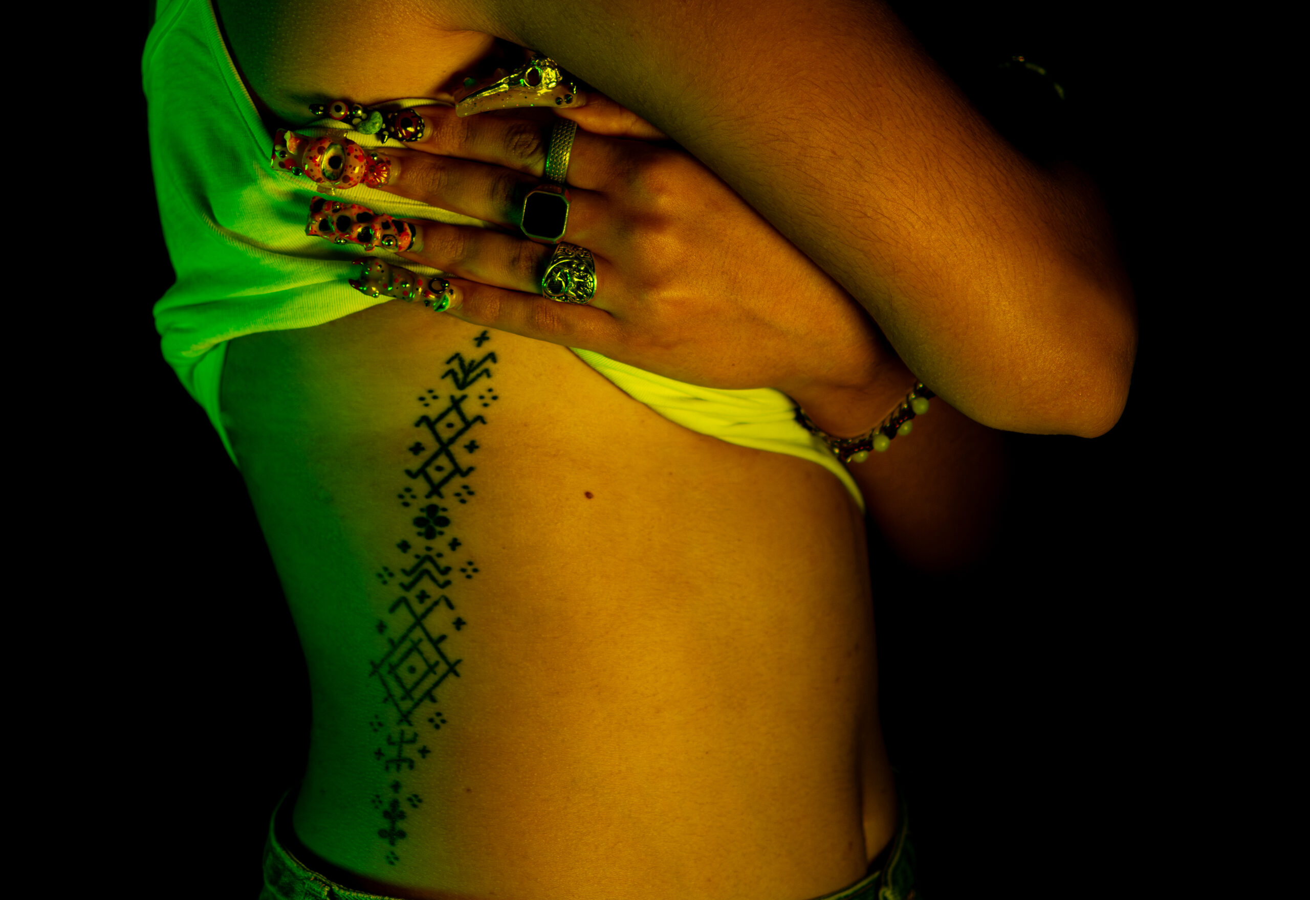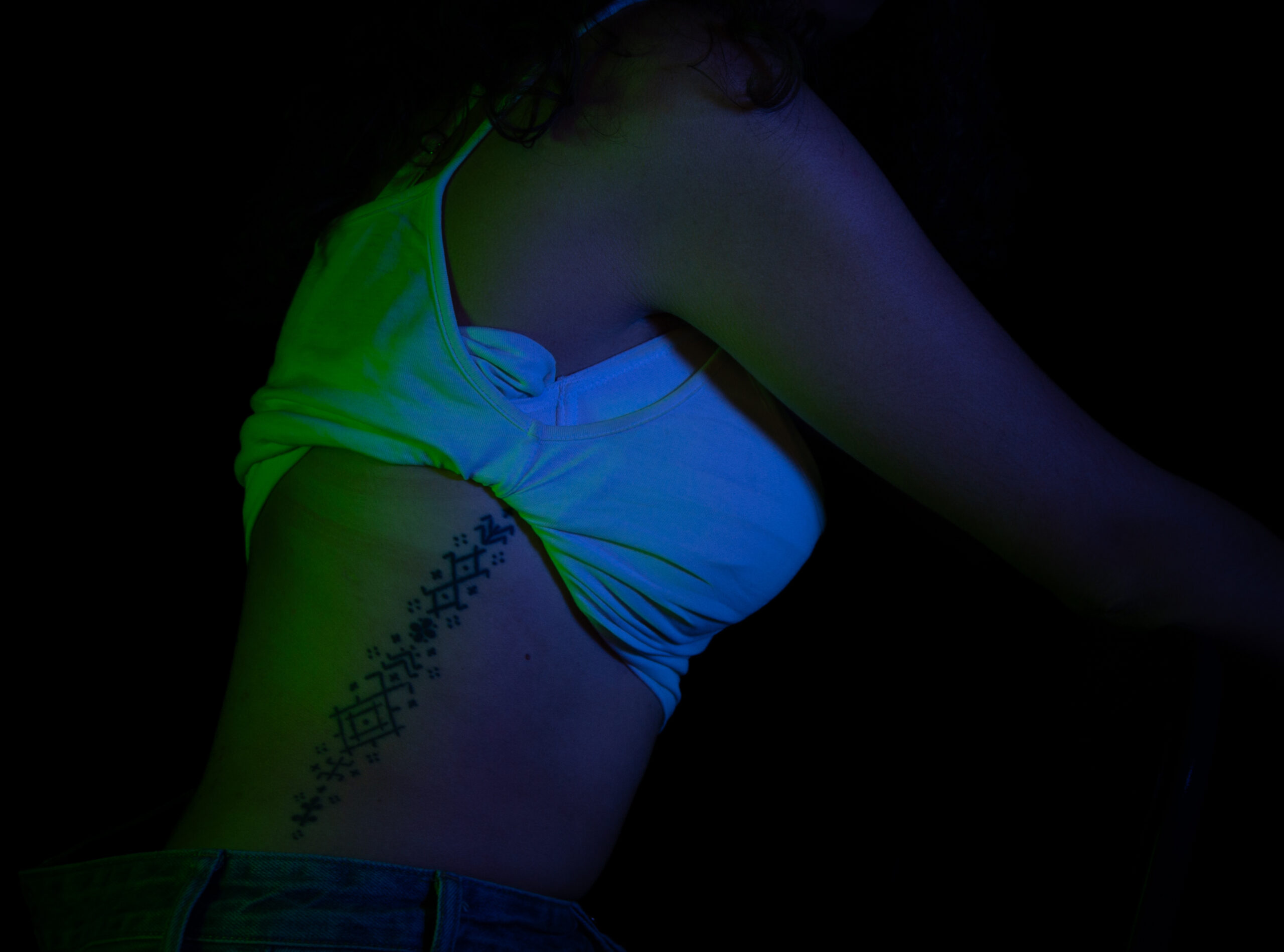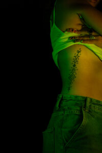 Cette dissociation volontaire permet de créer un dialogue visuel entre le corps, le souvenir et la culture, sans figer le tatouage dans une lecture symbolique unique.